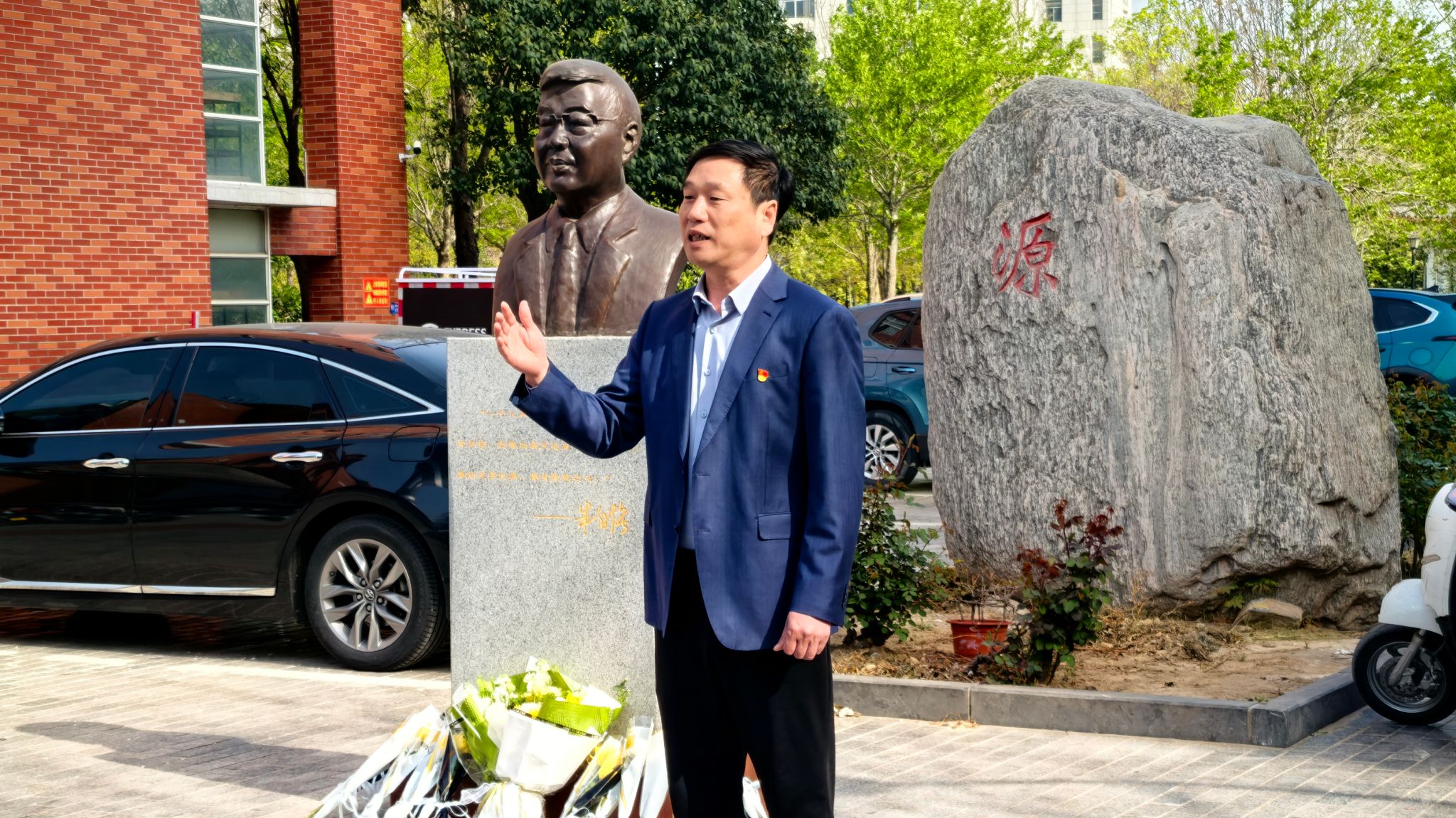理工科奠基人朱自强先生。 师生党员代表先行细致擦拭朱自强先生铜像。张慧向先生铜像敬献鲜花并行鞠躬礼。全体人员默哀三分钟,追思先生“春蚕到死丝方尽”的师道风骨。