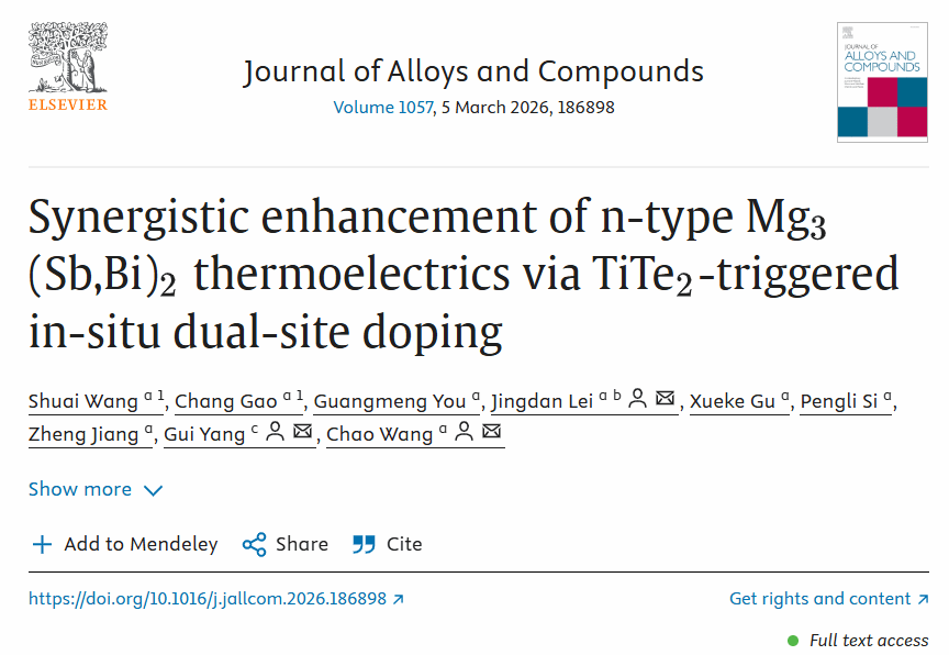 本科生的最新科研成果。2023级本科生王帅、高畅作为共同第一作者,在导师王超教授悉心指导下,完成了题为“Synergistic enhancement of n-type Mg3(Sb,Bi)2 thermoelectrics via TiTe2-triggered in-situ dual-site doping”的研究论文,充分彰显了成人性爱影片