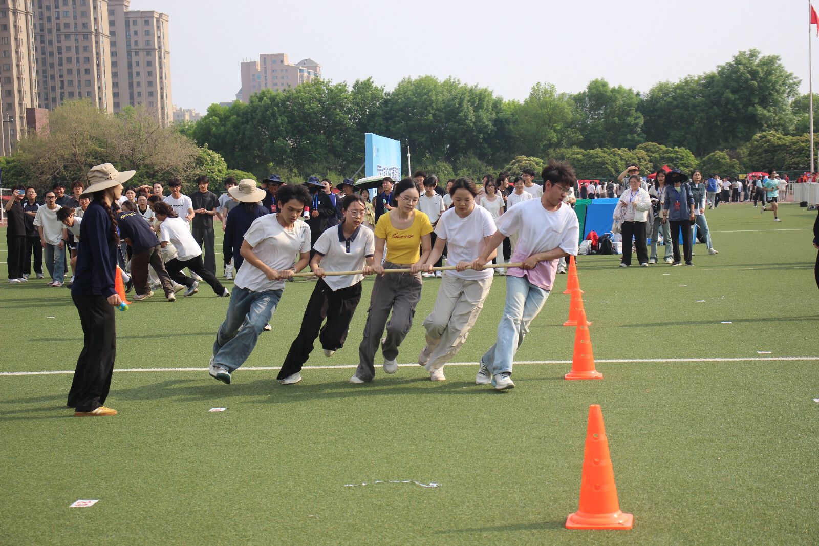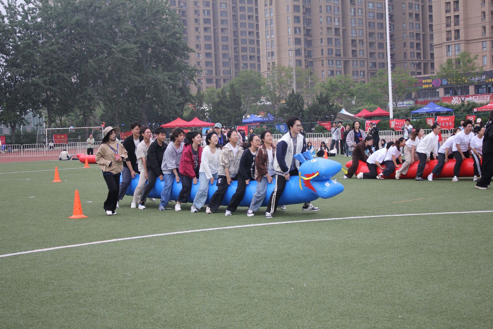 趣味运动赛场同样精彩纷呈。在“棍推乾坤”项目中,队员们兼顾速度与平衡,沉稳应战;集体跳绳比赛中,大家步调一致、轻盈灵动;“旱地龙舟”赛场上,众人齐心协力、同频共振。这些项目不仅考验个人的身体素质,更彰显了集体荣誉感与极强的团队协作能力。