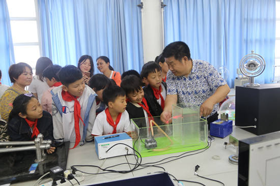 学生们自己制作的无人机、智能汽车模型、机器人等高科技产品吸引了孩子们的眼球,赞叹声不绝于耳;来到电磁学实验室,龙飞凤舞,逆风行舟,梦幻时钟,怒发冲冠,千里传音,穿墙而过……一个个应用声光电磁力等科学知识的趣味小实验既神秘又简单,孩子们积极参与,笑声阵阵,初进校园的那份拘谨早已不见了。