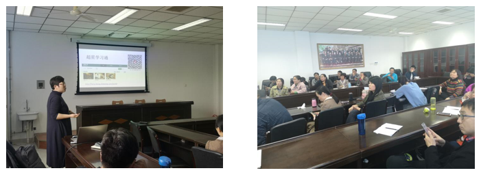 实验》课程,讲述了网络学习平台超星“学习通”各个模块的操作方法和她使用“学习通”的体验。她让在场老师下载学习通app,使用课程码进入课堂,通过投屏功能向老师们演示了如何在PC端建立自己的课程,包括课程封面设计、课程资料添加和试题库建立等。接着朱老师介绍了学习通在和学生互动方面的功能,如在线签到、随机选人、现场抢答、发送点评、现场投票和参与讨论等。最后朱老师还简要介绍了其他的网络教学学习平台,老师们可根据课程特点选择平台建课。
