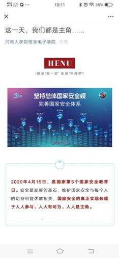 网站、电子显示屏、微信公众号上推送“国家安全教育”相关知识;在教师微信群宣传河南省教育厅微信公众号上推出的典型案件;在学生QQ群上传《坚持总体国家安全观 提高国家安全意识》PPT,PPT从危害国家安全的案例开始,分析了新形势下国家安全面临的压力和风险,要求学生提高认识,树立国家安全的主人翁意识。