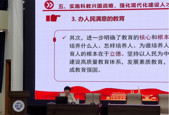 康缈老师首先阐述了党的二十大召开的重要意义并对党的二十大会议主题分六个层次进行了解读。之后从15个方面对党的二十大报告进行深层阐释:带领同学们深入学习领悟过去五年的工作和新时代十年伟大变革的重大意义;特别强调了关于党的二十大报告中有关“中国式现代化”的内涵,回顾百年党史分析解读“为什么要提中国式现代化?”,并强调“中国式现代化”的五大特征、九个方面的本质要求和重要意义;着重讲解了党的二十大报告中关于教育创新的表述,党的二十大报告强调“实施科教兴国战略,强化现代化建设人才支撑”,将教育与科技和人才并列,作为“全面建设社会主义现代化国家的基础性、战略性支撑”。