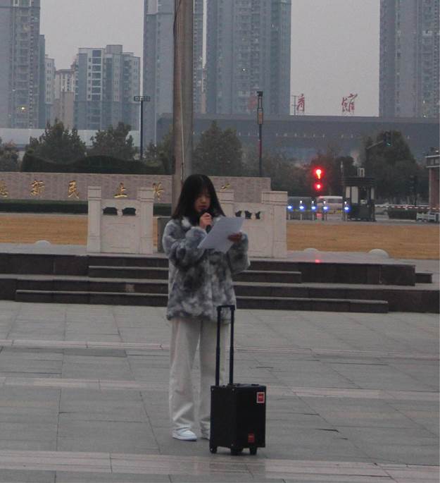 同学少年,风华正茂。2023级学生代表刘金华作国旗下演讲。她提到:国旗、国徽、国歌都是中华人民共和国的象征和标志,作为中华儿女,我们应了解并遵守我国关于国旗、国徽、国歌的相关法律,并且每时每刻都要以法律为准绳来维护国旗、国徽、国歌的尊严,维护国家形象,把爱国真正化为刻在骨子里的责任。