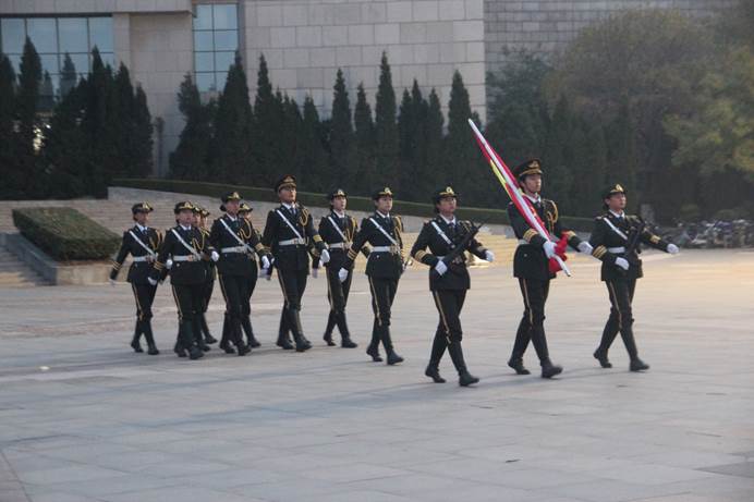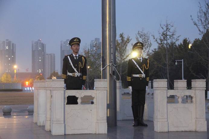 国旗护卫队队员们迈着矫健的步伐护送国旗走向升旗台,全体师生肃立注目,五星红旗在庄严的国歌声中冉冉升起。