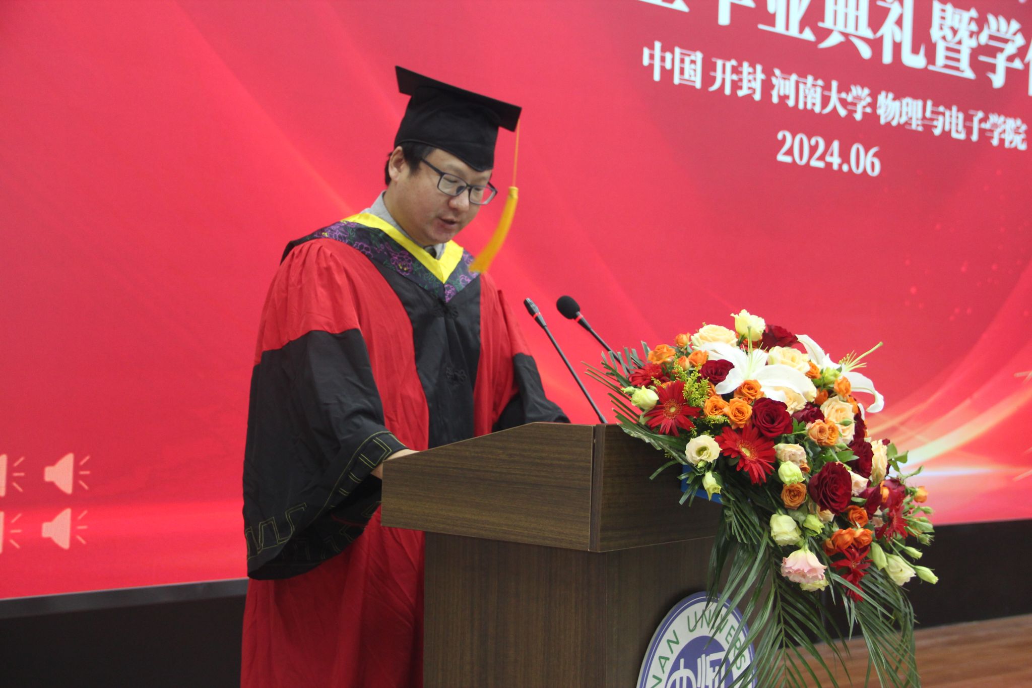 电子系主任谷城老师在讲话中反复告诫同学们不要忘记自己的理想和目标,要发现自己的兴趣和特长,到更大的世界中,和不同的人交流,体验多样的文化;还要时刻保持一颗感恩的心、谦虚的心,牢记“明德新民,止于至善”的校训,做一个合格的河大人,做一个合格的社会公民。