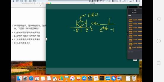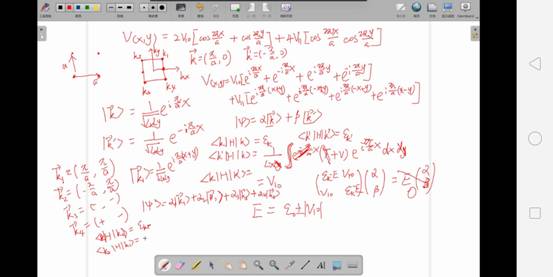 学老师张光彪老师,为了让我们更好地掌握知识,还设置了讨论课和习题课,专门解答同学们上课中的问题,比如,声子那一小节(图二)。为了跟线下上课一样,老师还准备了白板作为课堂上的“黑板”,如果有需要推导的公式,他就会一点一点的给我们推导,若果我们没有搞懂,他就会在给我们推一遍,我尤其印象深刻的是在讲近自由电子近似的时候,公式推导非常繁琐,头一天我花了好长时间也没有搞清楚,第二天,我就在课上请教了老师,老师很耐心的又给我们讲了一遍,虽然这个过程中我们花费了许多时间,但同时我们也收获了许多(图三)。